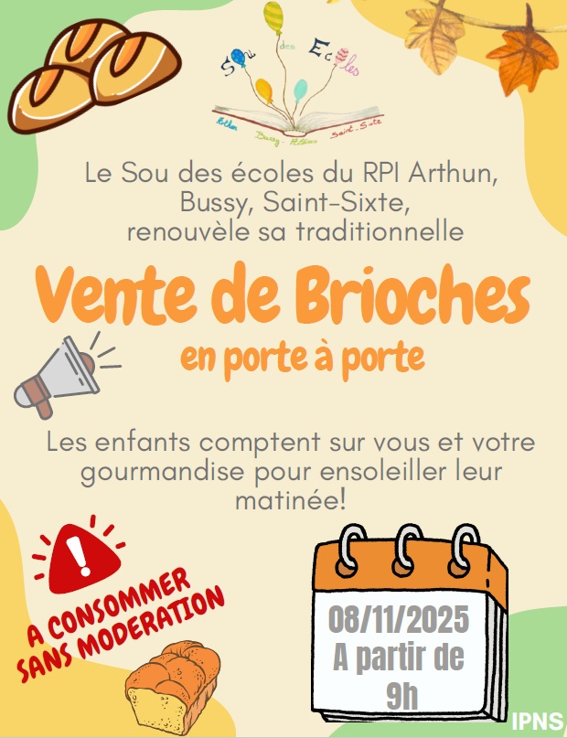 Le Sou des écoles d’Arthun, Bussy-Albieux et Saint-Sixte organise sa traditionnelle vente de brioches au profit des enfants de nos écoles.